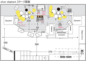 ◆ライヴハウスとの打ち合わせ図面。普通こんなところまでやんないよね。クリックすると大きい画像が見れます。って、機材がステージからはみ出てる)