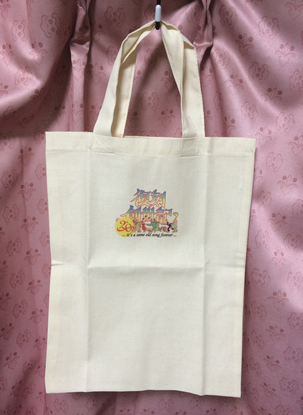 で、ワンマンライヴといえば、おみやげと物販。トートバッグに復刻創世記の20周年のマークを作って一枚一枚友人のTシャツ屋さんにプリントしてもらいました!物販はTシャツを作ったものの、サイズがでかすぎたか!?値段が高過ぎたか?半分しか売れませんでした。なので、メンバーで分けることになりました。とほほ〜。